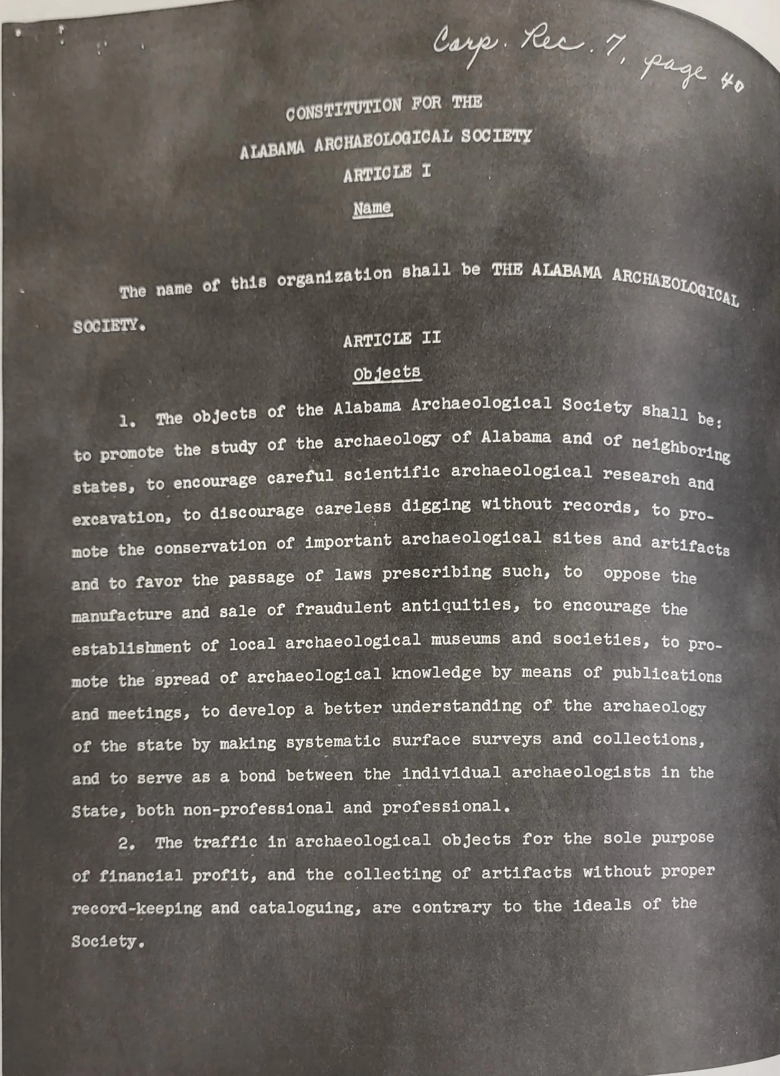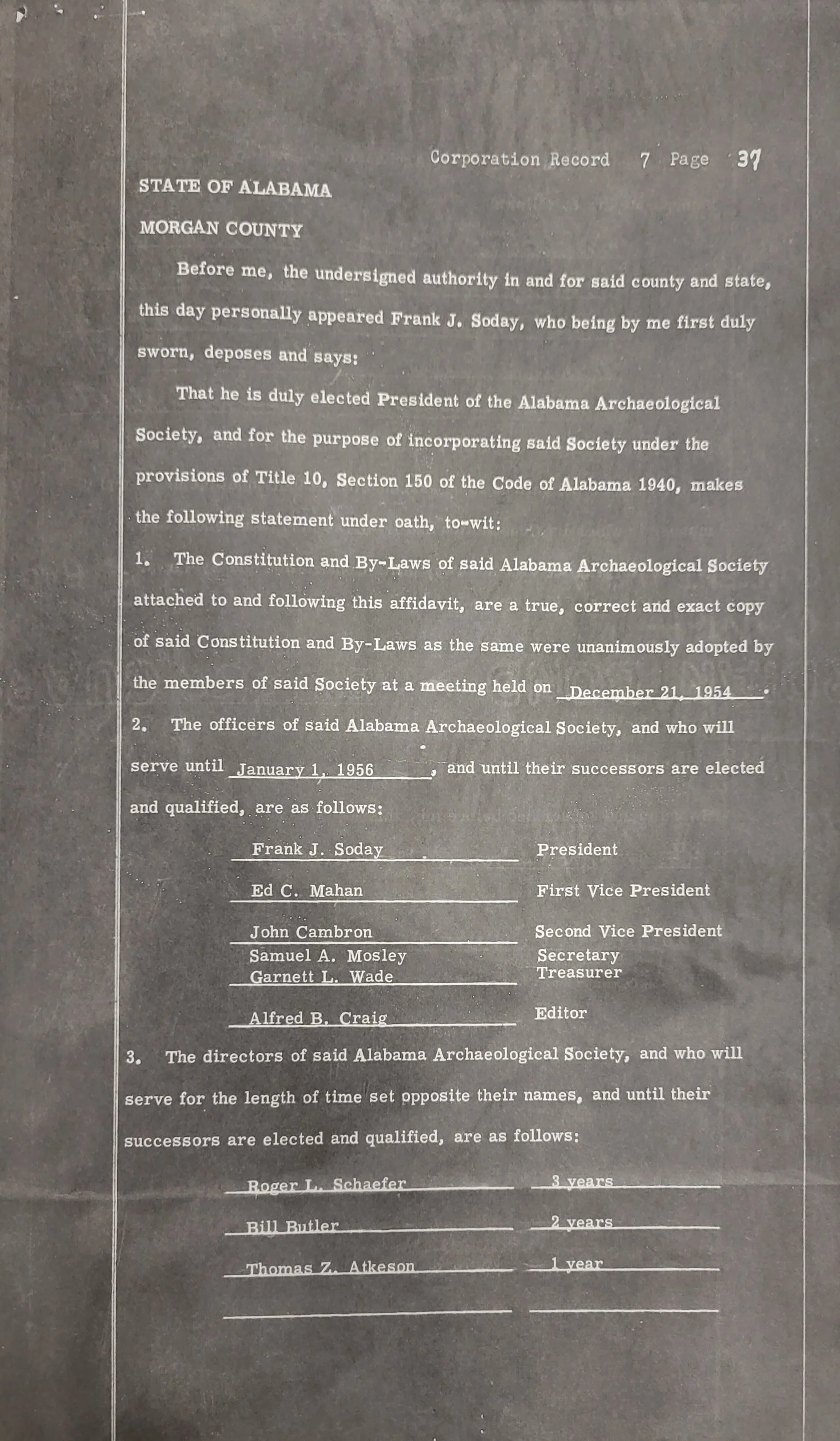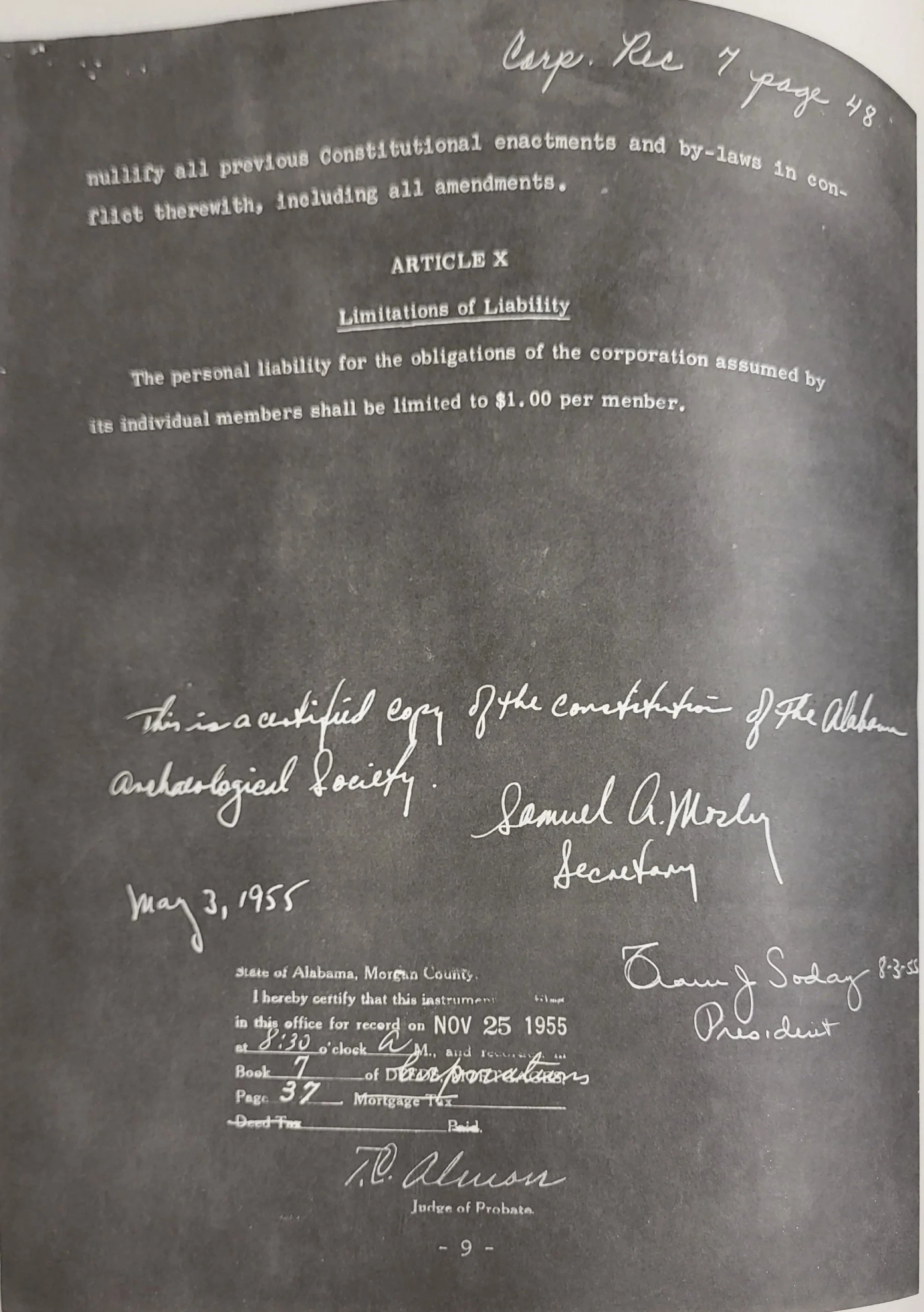 A search of the Morgan County Archives in Decatur, Alabama uncovered copies of the Alabama Archaeological Society’s original charter constitution document from 1955.